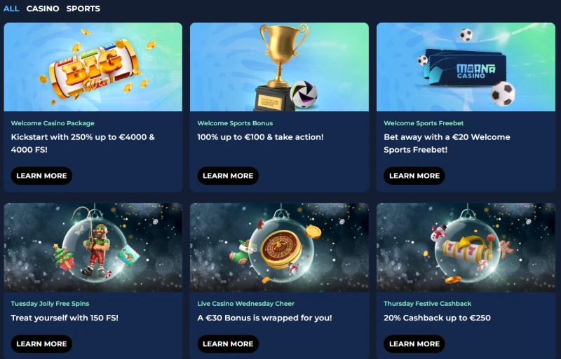 Nya spelare kan fĂ„ ett 250 % casinopaket upp till 4 000 ⏠plus 4 000 free spins pĂ„ sina tre första insĂ€ttningar, samt en separat 100 % sportbonus upp till 100 ⏠pĂ„ den första sportinsĂ€ttningen pĂ„ minst 20 âŹ.