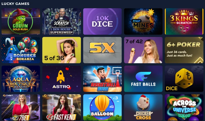 Lyckospelssektionen erbjuder omedelbar vinstvariation med skraplotter, tÀrning, nummerspel, bingo-liknande alternativ, mines-spel och lÀtta arkadval som Goblin Gold Rush, Balloon och Basketball Rush för korta, avslappnade sessioner. I Bord- & Crashspel-omrÄdet hittar du blackjack-varianter, inklusive 5-Hand Blackjack Pro och 22 Blackjack Free Bet, roulette-titlar som American Roulette och European Roulette Apollo, samt regionala favoriter som Andar Bahar.