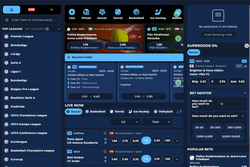 Moana Casino Swedens sportsbook erbjuder en komplett bettingupplevelse med konkurrenskraftiga odds pÄ fotboll, ishockey, tennis, basket och dussintals globala ligor. GrÀnssnittet Àr byggt för snabb navigering och ger dig liveodds, boostade marknader, snabb kuponglÀggning och verktyg som Bet Mentor och Popular Bets för att hjÀlpa dig fatta informerade beslut. FrÄn Premier League och Bundesliga till NHL och ATP-evenemang tÀcker Moana bÄde stora turneringar och nischade ligor, sÄ svenska spelare alltid hittar nÄgot att spela pÄ.