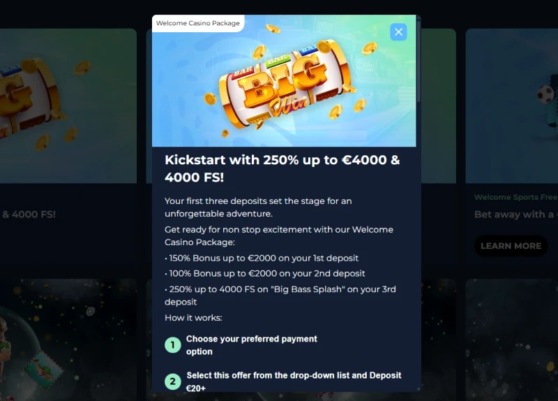 För casinospelare Ă€r det nuvarande casino Moana Sverige vĂ€lkomstpaketet en 250% bonus upp till 4 000 ⏠+ 4 000 Free Spins pĂ„ Big Bass Splash, fördelat pĂ„ tre insĂ€ttningar (varje pĂ„ minst 20 âŹ):