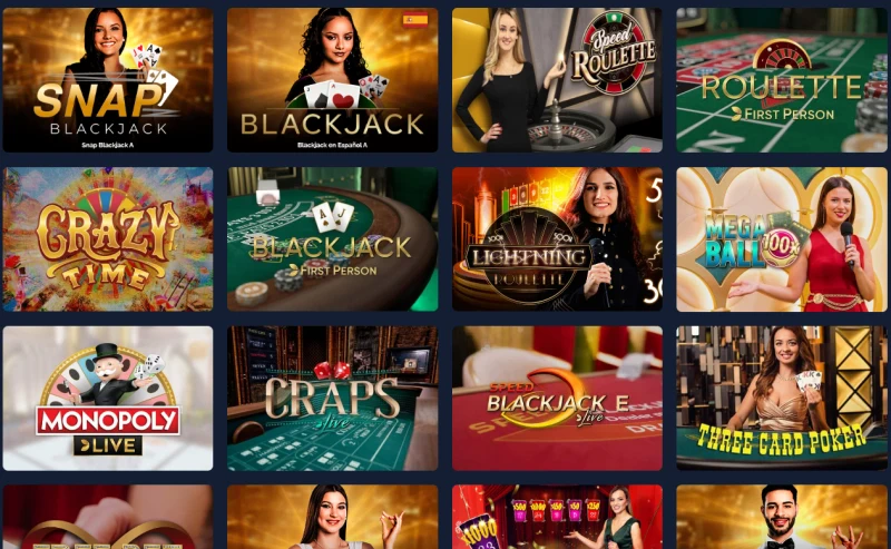 Gameshows & specials: Crazy Time, Monopoly Live, Mega Ball 100x, Craps Live och live bingo-liknande spel.
